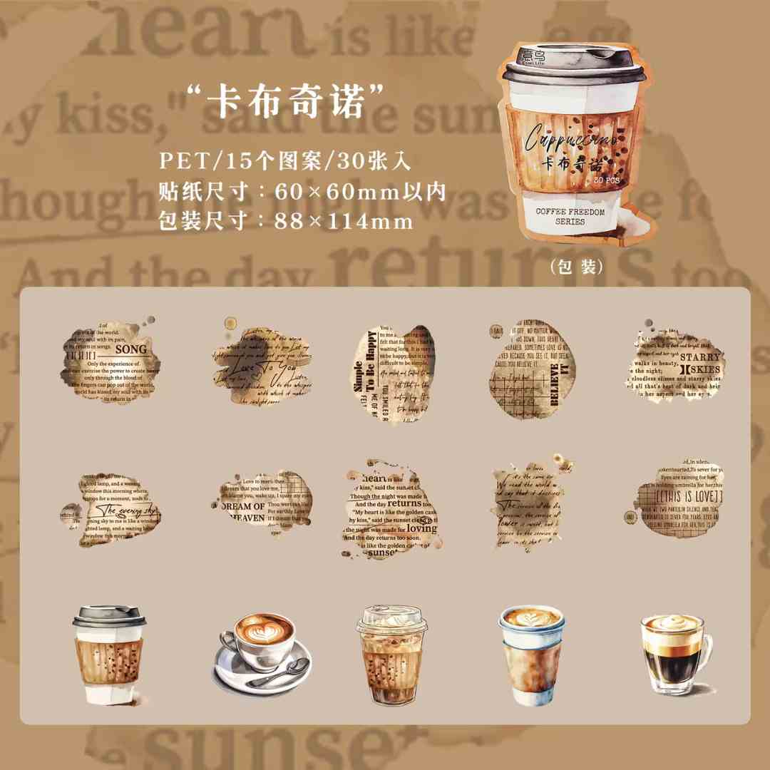 This set includes 30 high-quality PET stickers featuring cozy, coffee-inspired quotes and designs. Made from durable, waterproof PET material, these stickers have a smooth finish and vibrant print quality. Perfect for decorating journals, planners, laptops, phone cases, scrapbooks, and other DIY projects—ideal for coffee lovers and aesthetic stationery fans.
