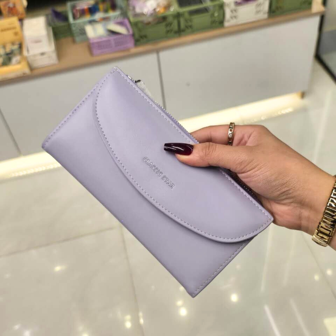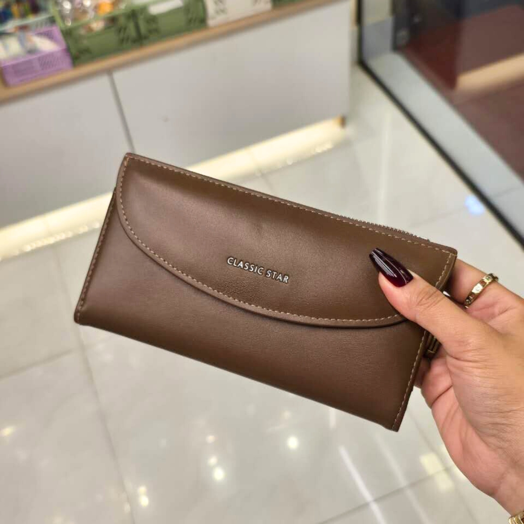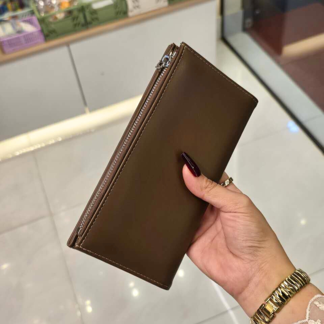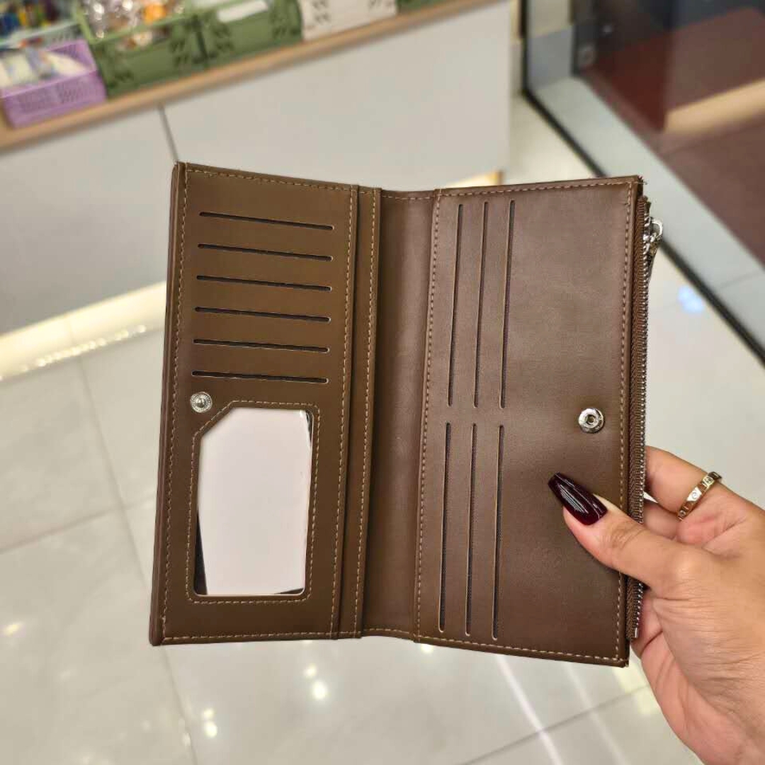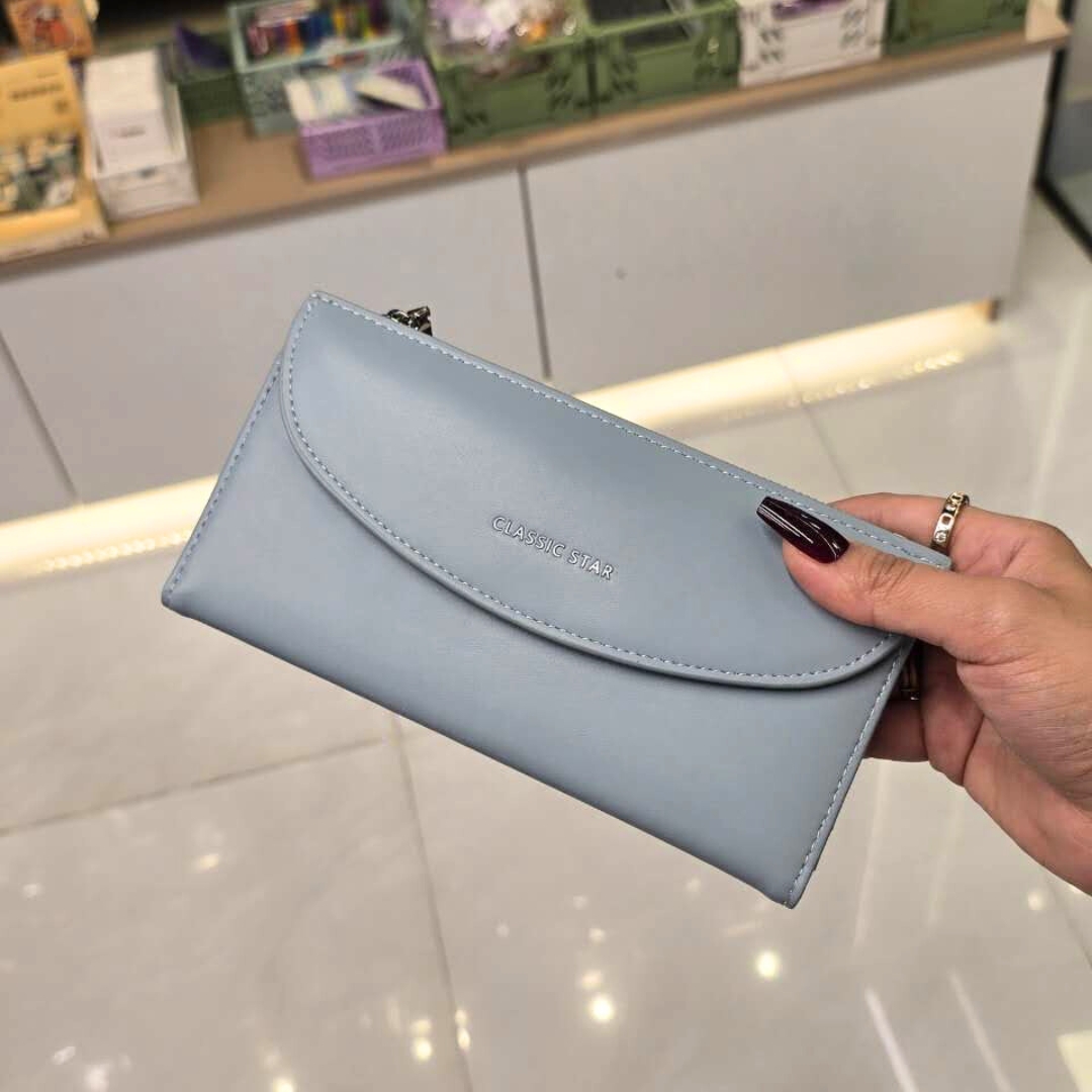 Stylish long wallet made from soft PU leather, featuring a front pocket with chain and multiple card compartments. Available in three elegant colors.